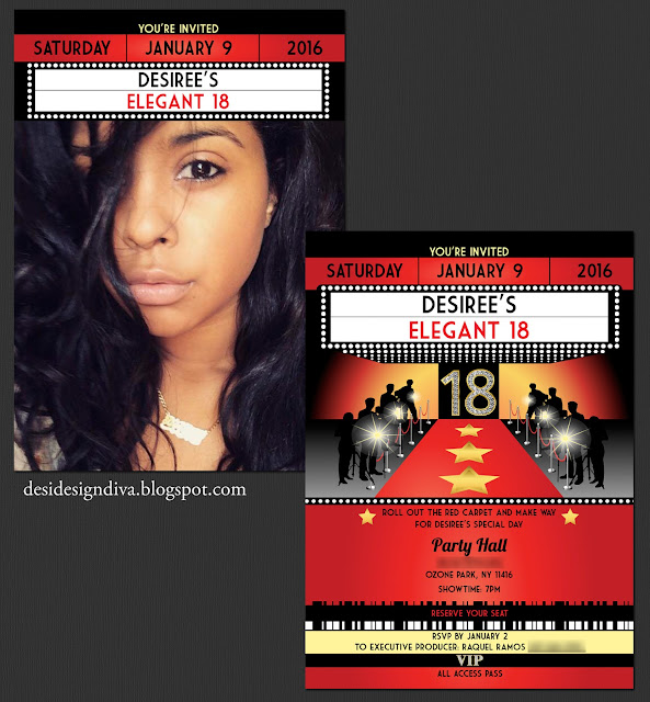 Have you heard of Elegant 18 birthdays? I absolutely love the theme that Raquel is planning for her daughter Desiree (love that we share the same first name!) It's a red-carpet premier party! I had a lot of fun with wording on this custom design. You can't tell from this photo, but she opted to have it printed on pearlized glitter card stock, which adds another layer of star-studded quality to set the stage for the big event. Thank you Raquel and Happy Birthday Desiree!